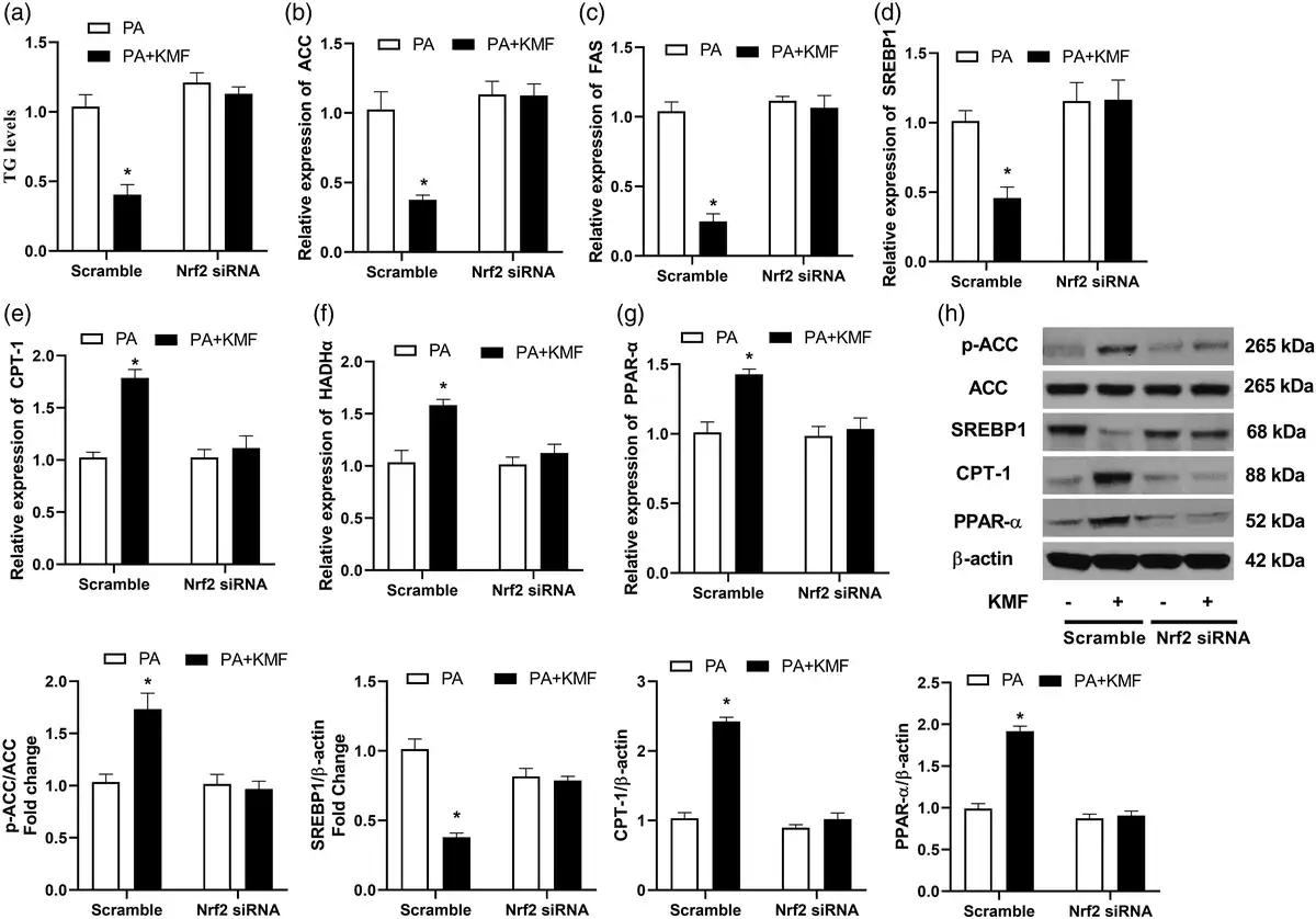 Next, we studied the function of Nrf2 activation in PA-treated cells. Importantly, we observed an increase in TG level in Nrf2 knockdown cells following PA treatment or even in the cells co-treated with PA and KMF (p < 0.01) (Figure 5(a)). In addition, the inhibitory effect of KMF on TG level in PA treated cells was significantly abolished by Nrf2 inhibition (Figure 4(a)). At the molecular level, the KMF-mediated inhibition of the expression of FAS, ACC and SREPB-1 was not observed in the knockdown of Nrf2 (Figure 5(b)–(d)). These findings were confirmed at the protein level of p-ACC and SREBP1 (Figure 4(h)). We also observed that Nrf2 inhibition using siRNA suppressed the KMF-induced activation of genes involved in β oxidation (CPT-1, HADHα and PPAR-α) (Figure 5(e), (f) and (h)). Taken together, above findings suggest that that KMF-mediated the inhibition of lipid accumulation in hepatocytes might be mediated through activation of the Nrf2 signaling pathway.