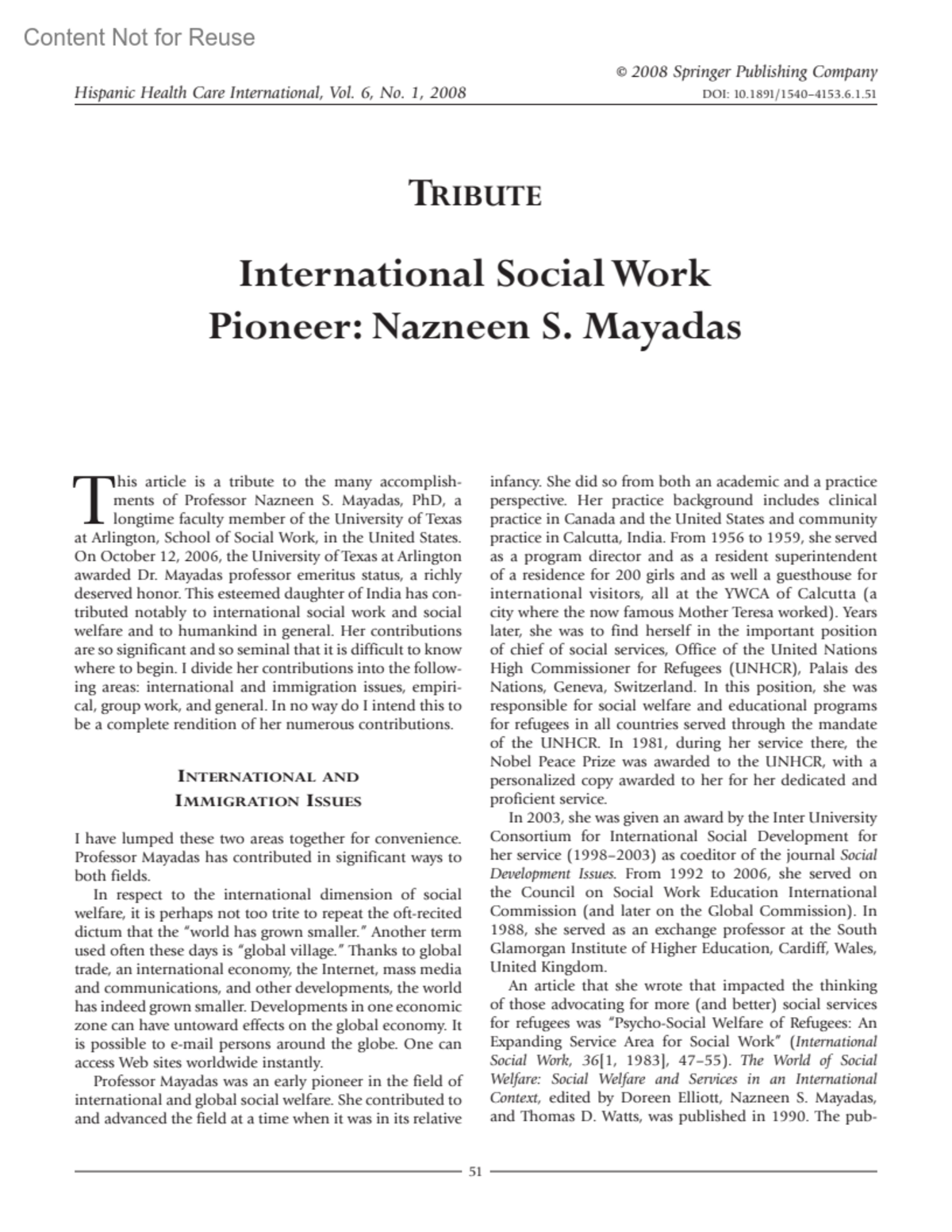 International Social Work PioneerNazneen S. MayadasWatts, Thomas D. PhDAuthor informationUniversity of Texas at ArlingtonHispanic Health Care International 6(1):p 51-53, 2008.Copyright © Copyright of Springer Publishing Company, 2008. All Rights Reserved.