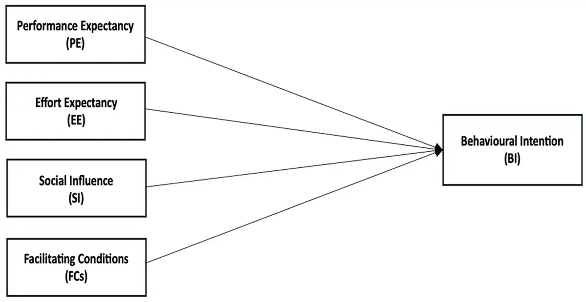 One of the most comprehensive and widely recognised models in the field is the Unified Theory of Acceptance and Use of Technology (UTAUT), proposed by . The UTAUT integrates elements from various technology acceptance theories, aiming to offer a unified framework for understanding the factors influencing individuals’ acceptance and use of technology in organisational settings (). This model identifies four key determinants of technology acceptance: performance expectancy, effort expectancy, social influence and facilitating conditions. Additionally, it considers moderating factors such as gender, age, experience and voluntariness of use.