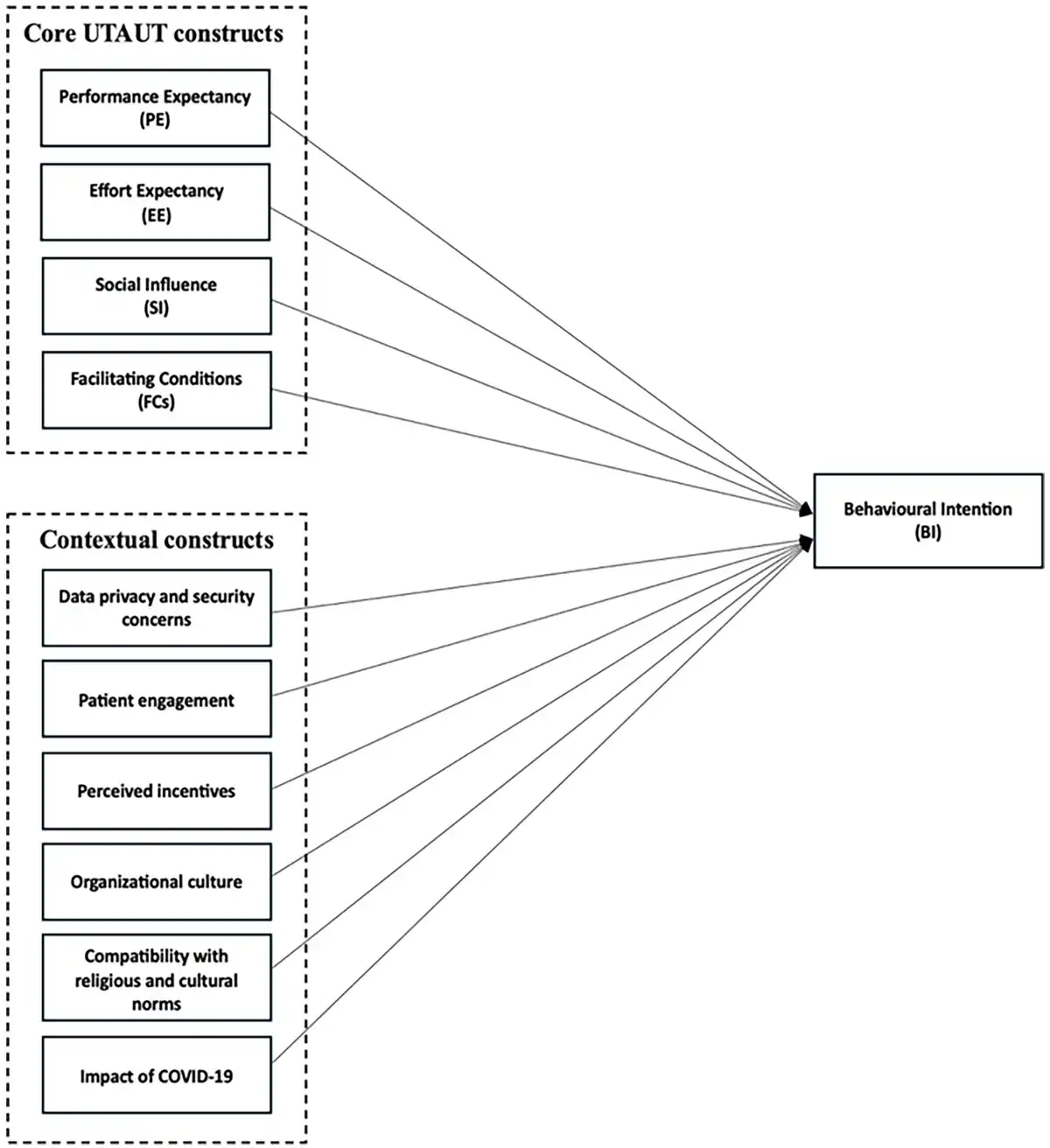 This subsection discusses our extension of the conventional UTAUT model to consider additional factors that significantly influence the adoption of m-health apps in settings such as Saudi Arabia. These factors are compatibility with religious and cultural norms, data privacy and security concerns, patient engagement, organisational culture and the impact of the COVID-19 pandemic. This analysis emphasises how adapting and expanding the model advances a more comprehensive understanding of technology adoption in diverse sociocultural landscapes.