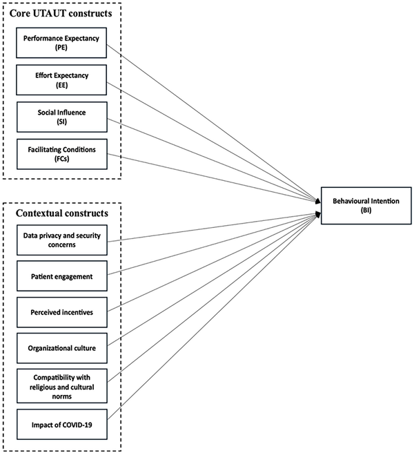 The study aimed to extend the original UTAUT by exploring additional factors specific to the Saudi Arabia context. By incorporating qualitative methods alongside the main determinants of UTAUT, the research seeks to identify context-specific influences on physicians’ acceptance and use of m-health technologies, offering a more comprehensive framework for understanding technology adoption in health care (Figure 1).