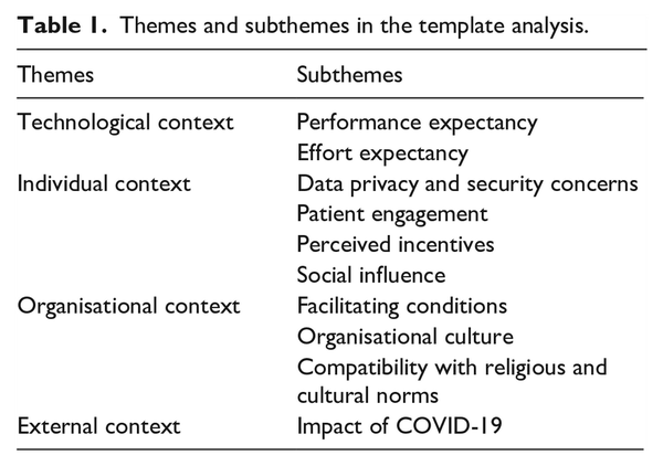 The final template included four themes: technological, individual, organisational and external contexts (Table 1). These themes and subthemes are described in detail in the following sections.
