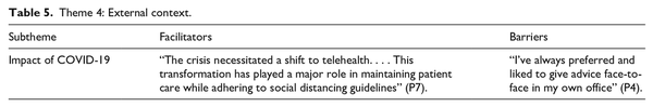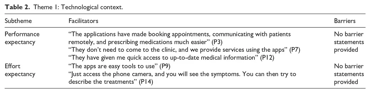 Before the COVID-19 pandemic, some of the physicians preferred face-to-face consultations, but the crisis has changed their perspectives, driving them to reconsider the use of mobile health technologies: “I’ve always preferred and liked to give advice face-to-face in my own office” (P4). The ensuing social distancing measures highlighted the crucial role and necessity of these innovations in maintaining continuous patient care: “The crisis necessitated a shift to telehealth. . . . This transformation has played a major role in maintaining patient care while adhering to social distancing guidelines” (P7).