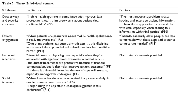 This theme focused on the individual-level factors influencing physicians’ decision-making regarding using m-health apps. It was divided into four subthemes: data privacy and security concerns, patient engagement, perceived incentives and social influence (see Table 3).