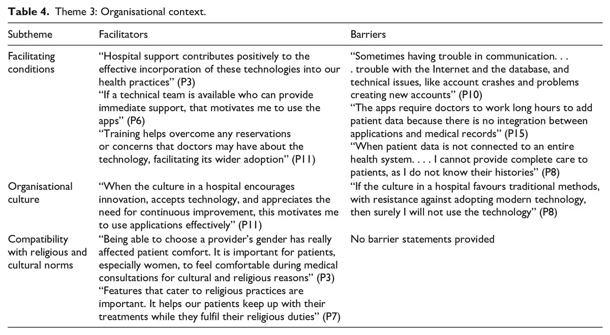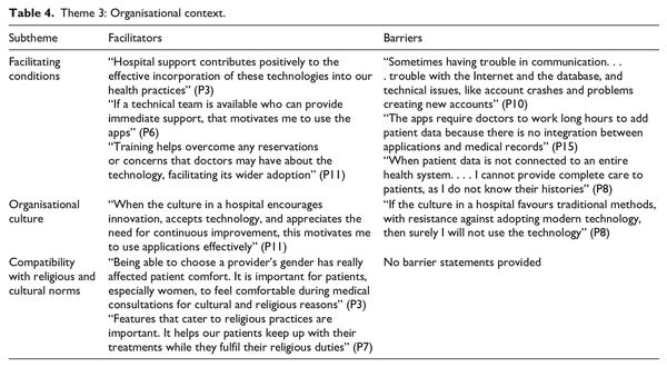 Organisational context was related to the role of healthcare organisations in promoting m-health apps. This theme was divided into three subthemes: facilitating conditions, organisational culture and compatibility with religious and cultural norms (see Table 4).