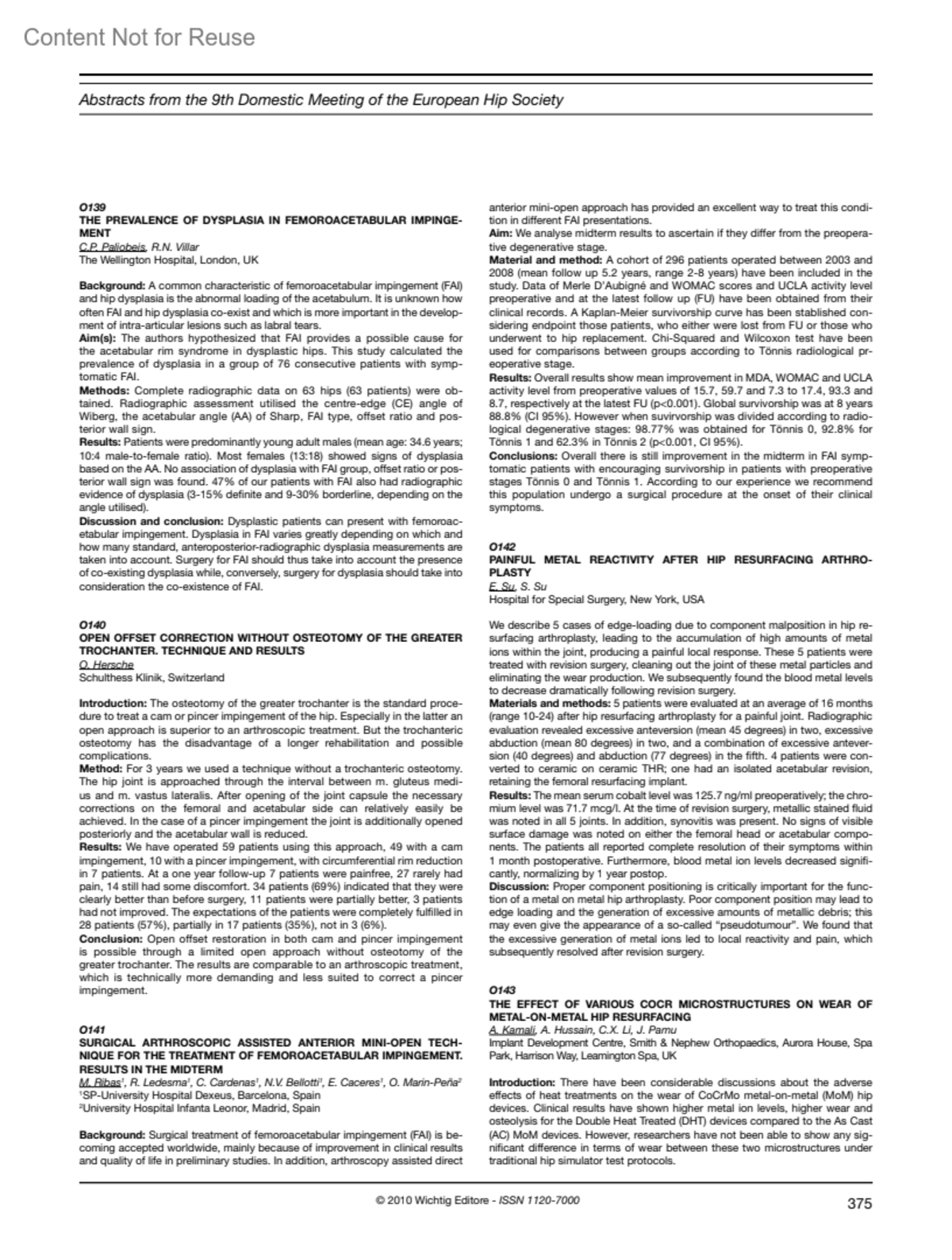 THE PREVALENCE OF DYSPLASIA IN FEMOROACETABULAR IMPINGEMENTO139Paliobeis, C. P.Villar, R. N.Author informationThe Wellington Hospital, London, UKHip International 20(3):p 375, July-August-September 2010.Copyright © 2010 Wichtig Editore