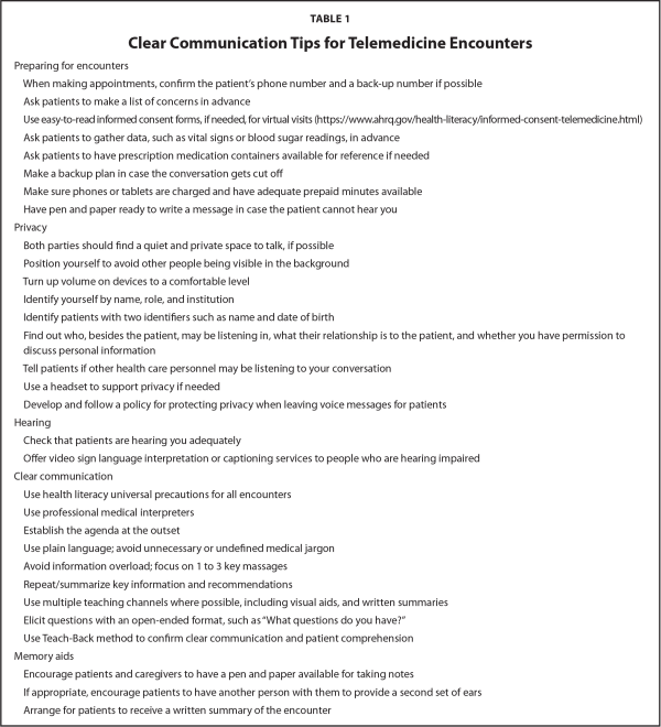 These clear communication best practices and a variety of other recommendations for patient-centered care during telemedicine encounters are listed in Table 1. During telemedicine encounters, patients should be encouraged to take notes if possible, and a written visit summary should be provided electronically or by mail if desired.