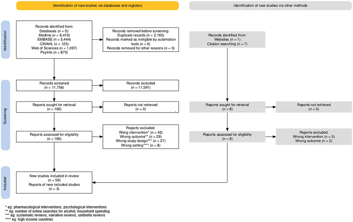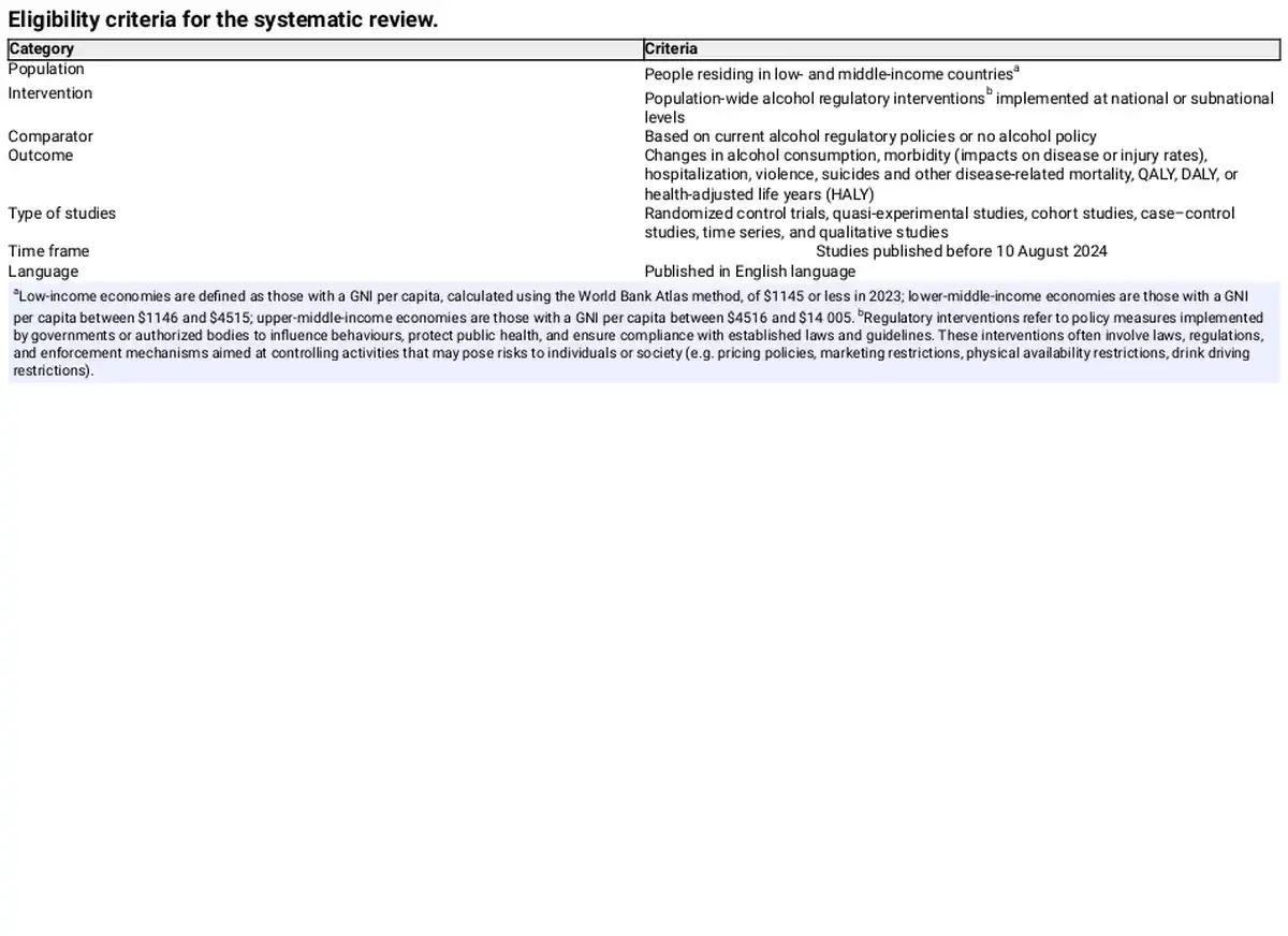To be included in this review studies should have assessed the effectiveness of alcohol regulatory policies in LMICs, focusing on population-wide interventions and their impact on alcohol consumption and health outcomes. It considered randomized control trials, quasi-experimental studies, cohort studies, case–control studies, time-series studies, and qualitative studies published in English before 10 August 2024.
