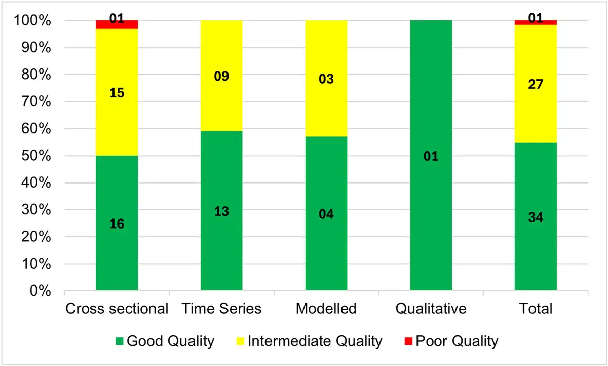 Over half (55%) were of good quality, 43% were of moderate quality, and one (2%) was of poor quality. Figure 2 provides a comprehensive overview of the quality assessment of studies by study design, as well as the overall quality of the studies included in the systematic review.