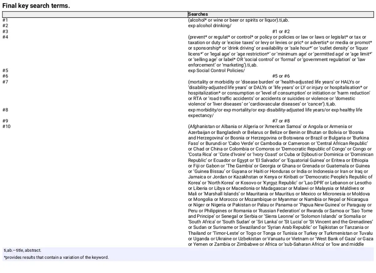 We conducted a systematic search across MEDLINE, EMBASE, CINAHL, PsycINFO, and Web of Sciences., using terms related to alcohol consumption, health outcomes, and interventions. The final search was done on 10 August 2024. Details of the search strategy are provided in Supplementary file 1. We also searched grey literature using search terms such as ‘alcohol control policies’, ‘alcohol prevention’, including research organizations, government websites, and Google Scholar, and contacted corresponding authors when necessary. Additionally, reference lists of relevant books and articles were reviewed, including the third edition of the ‘Alcohol: No Ordinary Commodity, Research and public policy’ () and its reference list. Table 2 provides the final key search terms.