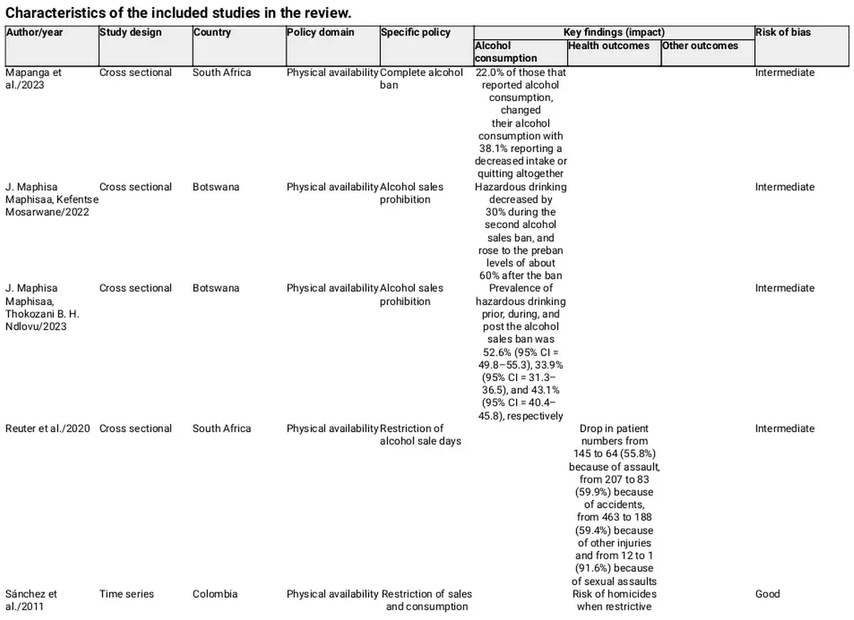 Two studies evaluated the impact of a national alcohol sales ban on hazardous drinking in Botswana, 2020–2021. The first, conducted from August to September 2020, found a reduction in hazardous drinking from 91.7% before the ban to 62.3% during, rebounding to 90.4% postban (). The second, from June to September 2021, reported a decrease from 52.6% preban to 33.9% during, rising to 43.1% postban (). In South Africa, 38.1% of current drinkers reduced or quit alcohol during the COVID-19 lockdown sales ban from March 2020 to October 2021 (). Subramanian et al. found no difference in alcohol consumption between Indian states with varying ban levels (). In Thailand, raising the legal purchase age for alcohol had no effect on consumption among high-risk youth (), as underage individuals continued buying alcohol in areas with lax enforcement (). In Zacatecas, Mexico, a law mandating a 2 a.m. bar closing and 10 p.m. off-premises alcohol cut-off saw noncompliance in 27% of bars and 53% of stores, but breath testing revealed a 30% reduction in blood alcohol concentration and heavy drinking late at night, along with fewer physical fights and drunk customers during festive periods ().