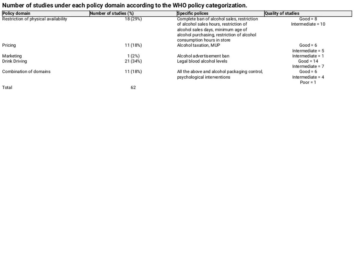 Overall, 21 studies focused on interventions aimed at restricting drink driving, while 11 studies assessed a combination of interventions across all the policy domains. Table 4 provides a summary of the studies by WHO alcohol policy domain with specific policies and quality of studies under each domain.