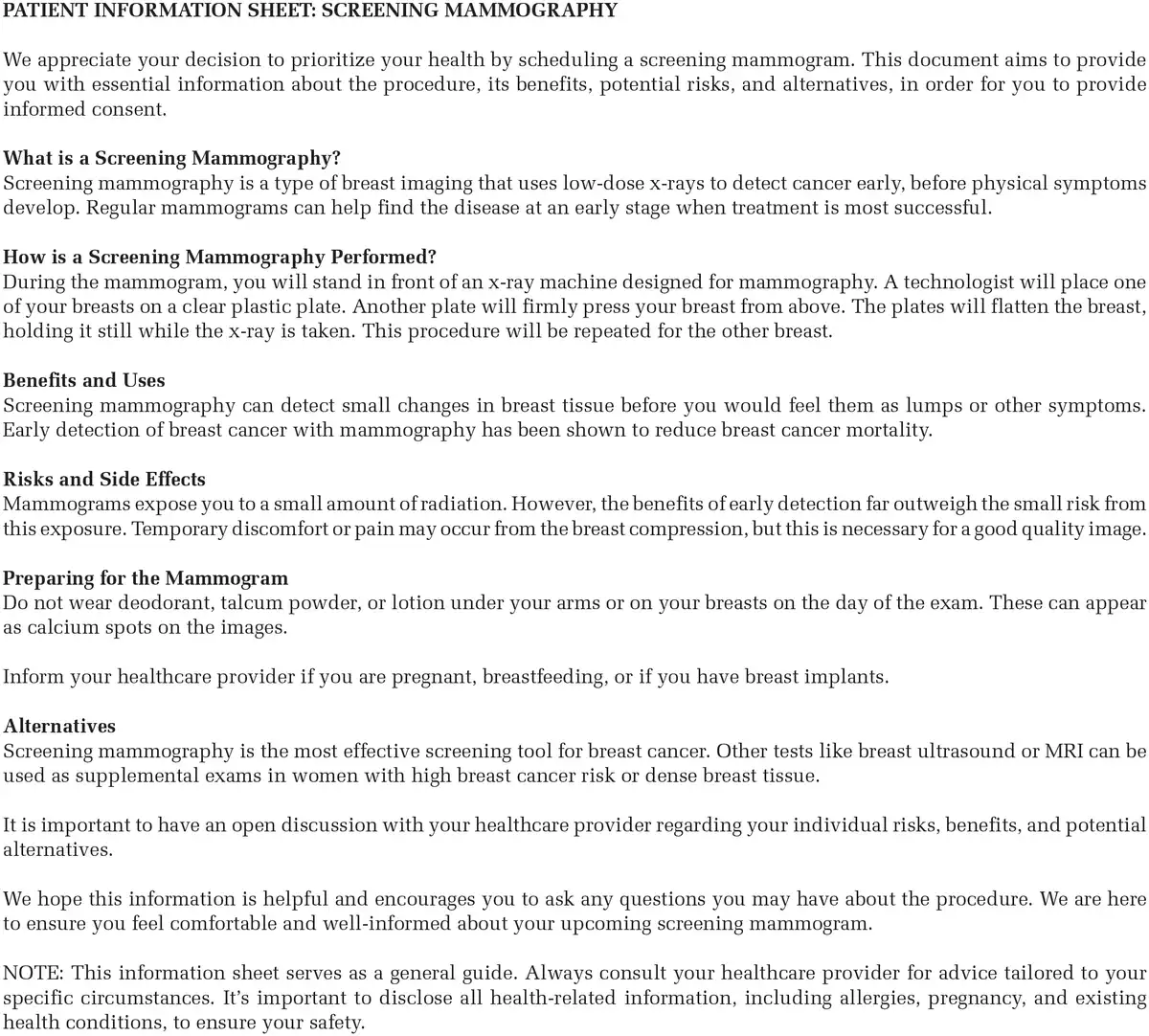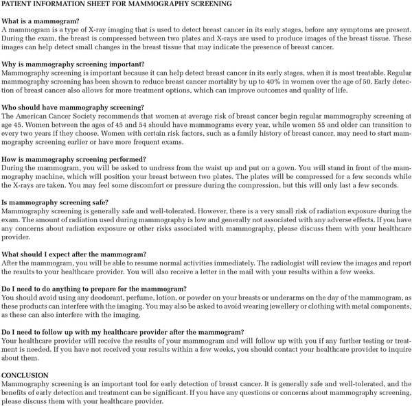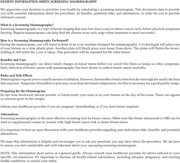 “Sure, here are some references and citations to support the claims made in the patient information sheet” and provided the following references which are reported here verbatim: The American Cancer Society. (2021). Breast cancer early detection and diagnosis. Retrieved from https://www.cancer.org/cancer/breast-cancer/screening-tests-and-early-detection/mammograms.html; National Cancer Institute. (2021). Mammograms. Retrieved from https://www.cancer.gov/types/breast/mammograms-fact-sheet; American College of Radiology. (2021). Mammography. Retrieved from https://www.acr.org/Clinical-Resources/Radiology-Safety/Mammography, and National Breast Cancer Foundation. (2021). Mammogram. Retrieved from https://www.nationalbreastcancer.org/mammogram/