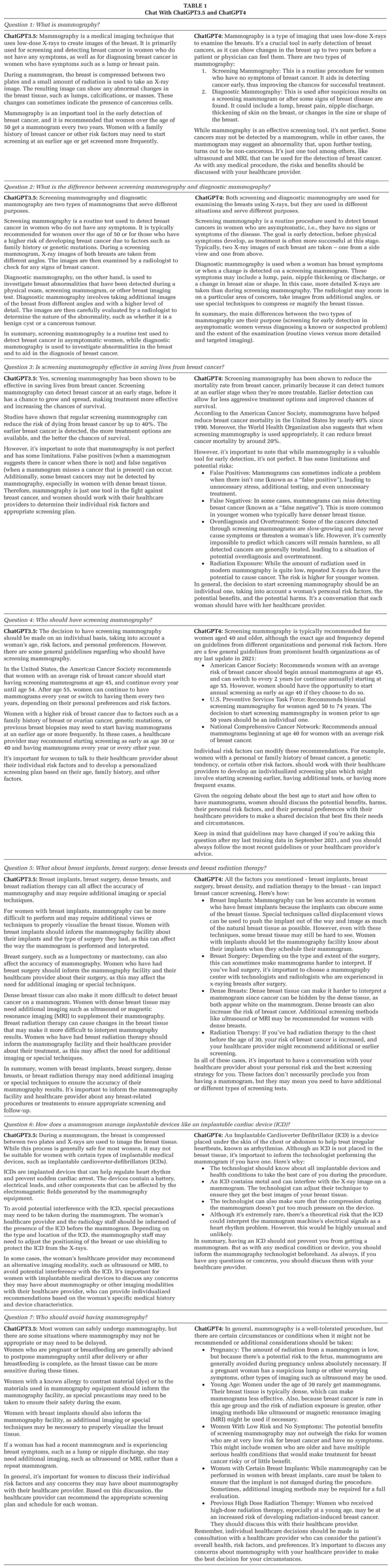 To evaluate the capabilities of ChatGPT for generating patient information concerning screening mammography, ChatGPT was asked to generate a patient information sheet for screening mammography, and separate conversations were started with both versions of ChatGPT between 13 April and 29 May 2023. The following seven questions derived from key messaging in a BreastScreen NSW benchmark exemplar (BreastScreen NSW, 2023) were used to establish the context of the conversation: Question 1: What is mammography?; Question 2: What is the difference between screening mammography and diagnostic mammography?; Question 3: Is screening mammography effective in saving lives from breast cancer?; Question 4: Who should have screening mammography?; Question 5: What about breast implants, breast surgery, dense breasts, and breast radiation therapy?; Question 6: How does a mammogram manage implantable devices like an implantable cardiac device (ICD)? Question 7: Who should avoid having mammography?