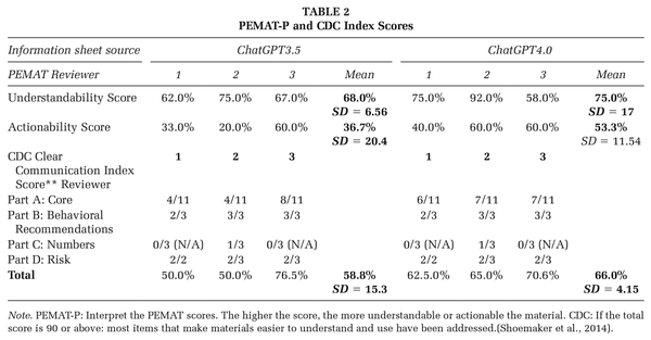 The PEMAT-P and CDC Index scores are presented in Table 2 (). ChatGPT4.0 was scored higher by the expert panel than ChatGPT3.5 for understandability, actionability, and clear communication.