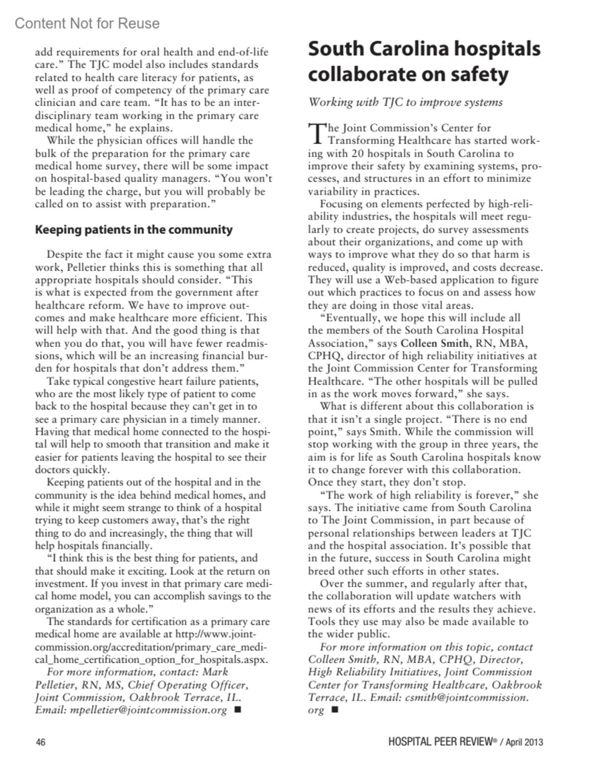 South Carolina hospitals collaborate on safetyWorking with TJC to improve systemsHospital Peer Review 38(4):p 46, April 2013.Copyright © 2013 AHC Media LLC.