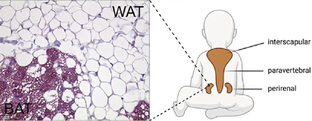 Histological appearance and localization of BAT in children. Perirenal adipose tissue stained for UCP1, transition between BAT and WAT. Schematic illustration of BAT localization in children (created with Biorender.com). BAT, brown adipose tissue; WAT, white adipose tissue; UCP1, uncoupling protein 1.
