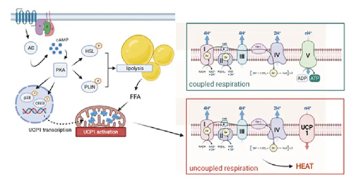 Mammals possess a specialized tissue that enables survival in the cold, providing a key evolutionary advantage. Although brown adipose tissue (BAT) shares structural similarities with white adipose tissue (WAT), its primary function is not to store energy but to produce heat by oxidizing fatty acids and/or glucose from intracellular energy stores and circulation. This allows survival during nocturnal cold as well as in winter, cold stress at birth, and may be advantageous if macronutrients (especially protein) are limited. In contrast to WAT, BAT is characterized by extensive vascularization and innervation. On the cellular level, brown adipocytes are histologically distinguishable from white adipocytes by their high abundance of lipid vesicles as well as high mitochondrial density, which contributes to the brownish appearance of BAT. These BAT mitochondria are rich in cristae and contain the specific functional protein uncoupling protein 1 (UCP1, Fig. 1) in the inner mitochondrial membrane, which enables thermogenesis.