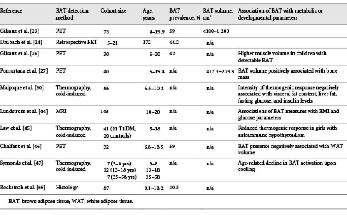 • 23. Gilsanz V, Smith ML, Goodarzian F, Kim M, Wren TA, Hu HH. Changes in brown adipose tissue in boys and girls during childhood and puberty. J Pediatr. 2012 Apr;160(4):604–9.e1. http://dx.doi.org/10.1016/j.jpeds.2011.09.035.