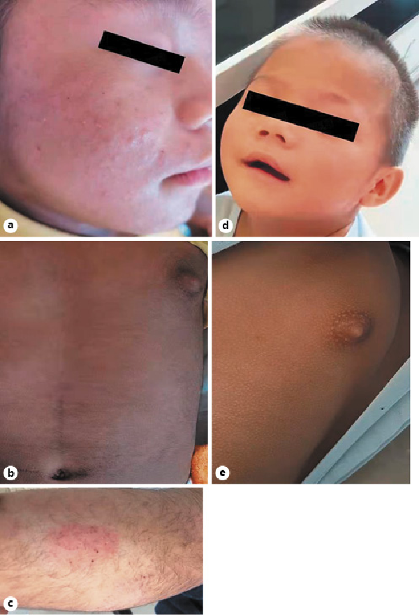 Clinical symptoms of the patient at admission and 10 months later. The symptoms at admission were shown on the left side; it is shown the patient’s acne-like papules on face (a), pigmentation of abdominal skin (b), and thick and long body hair on his legs (c). It also showed the improvement of those symptoms after 10 months on the right side, and it showed the patient’s improved facial acne (d) and the recovery of skin color (e).