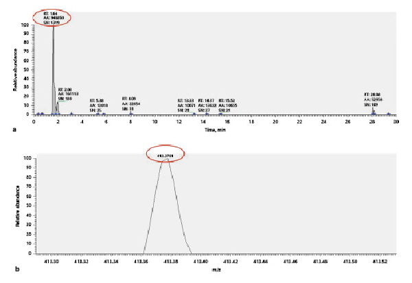 The imaging examination showed there were no obvious abnormalities in adrenal ultrasound and adrenal enhanced computed tomography (CT). The thyroid ultrasound test revealed normal as well. An abdominal ultrasound examination revealed that the liver was enlarged. Pituitary magnetic resonance imaging (MRI) showed pituitary hyperplasia, and skull MRI showed pituitary hyperplasia and uneven signal, and the sellar diaphragm was raised. Further sellar diaphragm-enhanced MRI showed no space occupying lesion. No abnormality was found in the positron emission tomography-computed tomography examination. The bone age (based on the X-rays of the left-hand bone) was 5.5 years old, which was much older than the chronological age. The chromosome karyotype of the patient was 46XY, and the results of the whole exon and Sanger sequencing of the CYP21A2 gene were normal and inconsistent with the clinical features. The cream and chicken essence seasoning were analyzed by high-performance liquid chromatography-tandem mass spectrometry (HPLC-MS) to detect whether there were exogenous steroids. A kind of phytosterol (avenasterol/clerosterol/chondrillasterol) with the molecular formula C29H48O was found in chicken essence seasoning; the chromatogram (Fig. 2a) shows that retention time is 1.64 min, peak area (AA) is 946,850, and the signal to noise ratio (S/N) is 1,319, and the mass spectrum (Fig. 2b) shows that the mass-to-charge ratio (m/z) is 413.3761. No hormones and steroids were found in the cream. For the chromatographic conditions, the extraction samples were analyzed using a Q Exactive plus mass spectrometer (ThermoFisher Scientific, Waltham, MA, USA) linked to an Ultimate 3000 UPLC (Dionex, Sunnyvale, CA, USA), and a hydrophilic pHILIC column (150 mm × 2.1 mm, 5 µm, Merck) was used for chromatographic separation. For the MS acquisition, the Q-Exacitve plus spectrometer with electrospray ionization was operated in the data-dependent acquisition mode using Xcalibur 4.0.27 software (ThermoFisher Scientific). The sample was detected in full scan mode with positive and negative switching scan.