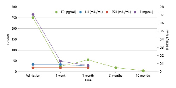 Changes of LH, FSH, E2, and T levels since decomposition of chicken essence seasoning. At admission, the patient had high levels of E2 and T but relatively low level of LH and FSH. As time went by, the level of E2 and T gradually returned to normal.