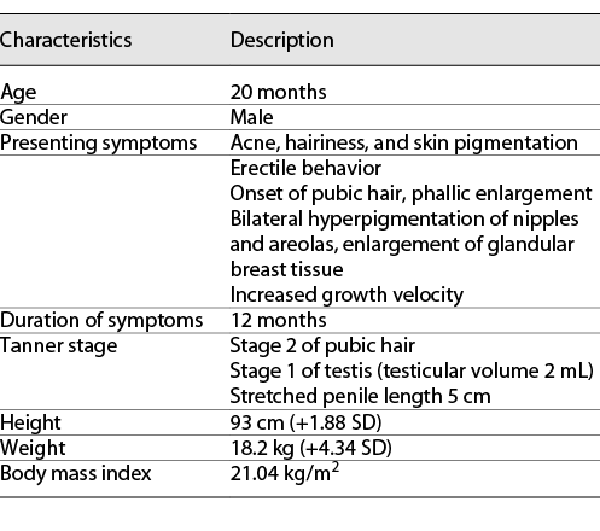 On physical examination, the patient’s length was 93 cm (1.88 SD above the mean for the sex and age []), and the weight was 18.2 kg (4.34 SD above the mean for the sex and age []). His muscles were developed, and the body fat distribution was decreased. Acne-like papules in the size of rice grains could be seen on the face and trunk, mainly on the face, red in color, with abscesses at the tip (Fig. 1a). The skin on the abdomen was darkly pigmented (Fig. 1b). Increased hairs were distributed in the forehead, back of the neck, upper limbs, both sides of the thighs, and lumbosacral region (Fig. 1c). He was found to have pigmentation on both nipples and areola. The breast tissue can be touched bilaterally, and the size is about 0.5 × 1 cm (Tanner stage of 2). Genitourinary examination showed that his two-sided testicles had descended to the scrotum with a volume of about 2 mL. The hyperpigmented penis was 5 cm (mean ± standard deviation for 2 years old: 3.54 ± 0.34 cm []) in length and 1.8 cm in diameter. Pubic hair can be seen at the root of the penis, reaching at the Tanner stage of 2. The clinical characteristics of this patient are shown in Table 1.