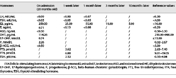 The patient was treated with compound glycyrrhizin tablets [] (12.5 mg oral administration, three times a day) to protect the liver, ursodeoxycholic acid tablets [] (200 mg oral administration, once a day) to reduce free cholesterol, and cetirizine hydrochloride tablets for anti-allergy treatment. At the same time, the patient was advised to avoid chicken essence seasoning food and cream and to monitor the level of sex hormones dynamically. After stopping the use of cream and avoiding the chicken essence seasoning diet for 1 month, examinations at the clinic follow-up showed that the level of E2 and T declined dramatically. At a follow-up after 10 months, the concentration of E2 decreased to a normal level. The decline trends of LH, FSH, E2, and T levels are shown in Figure 3. Furthermore, all of the clinical symptoms of the patient improved. We can see the improvements in facial acne (Fig. 1d), the recovery of skin color (Fig. 1e), the regression of whole-body hair, and the growth and development returned to normal. The differences between admission and 10 months later at clinical follow-up were compared and shown in Figure 1.