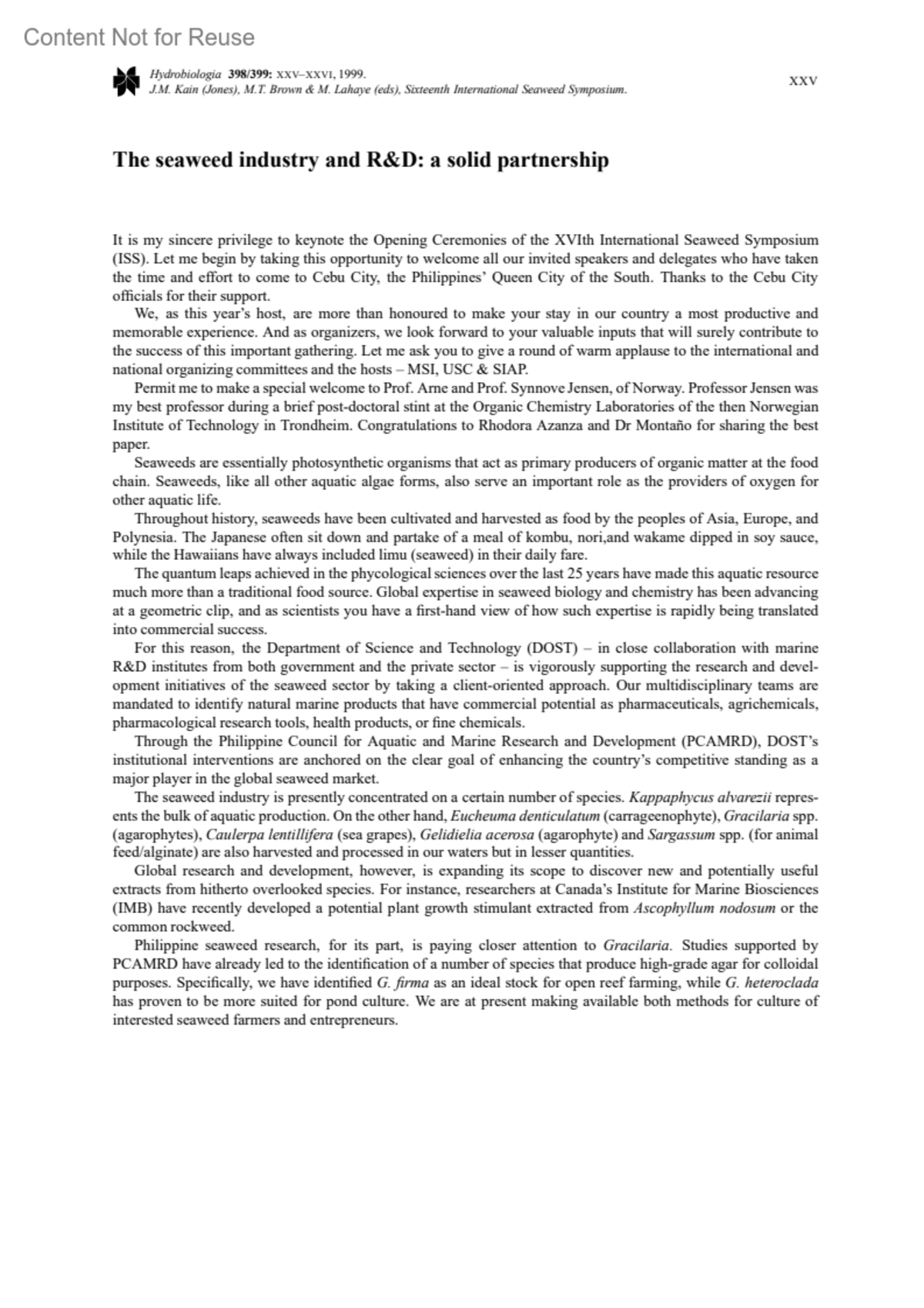 The seaweed industry and R&Da solid partnershipPadolina, William G.Author informationSecretary of the Department of Science and Technology, PhilippinesHydrobiologia 398(1):p XXV-XXVI, April 1999.Copyright ©1999 Kluwer Academic Publishers