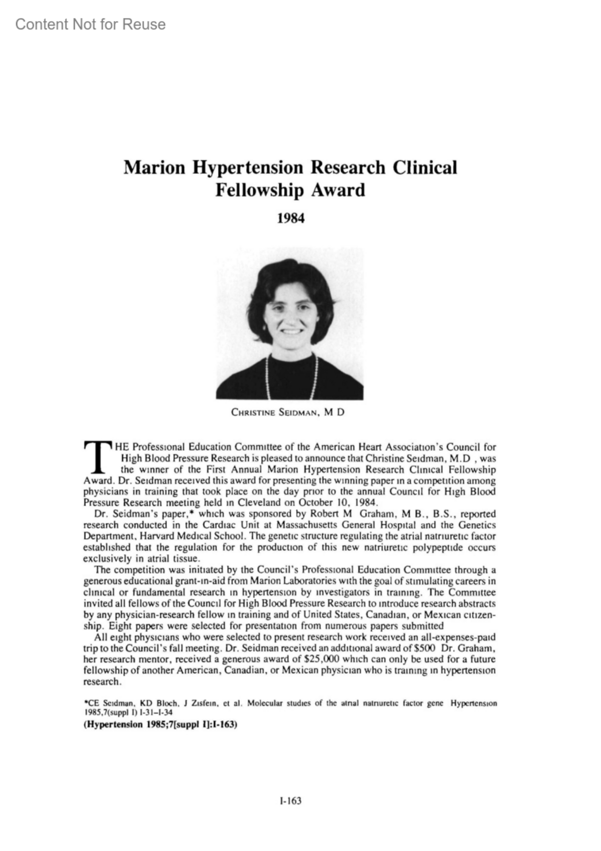 Marion Hypertension Research Clinical Fellowship Award1984SEIDMAN, CHRISTINE M.D.Hypertension 7(3):p 163, May-June 1985.Copyright © 1985 American Heart Association, Inc.