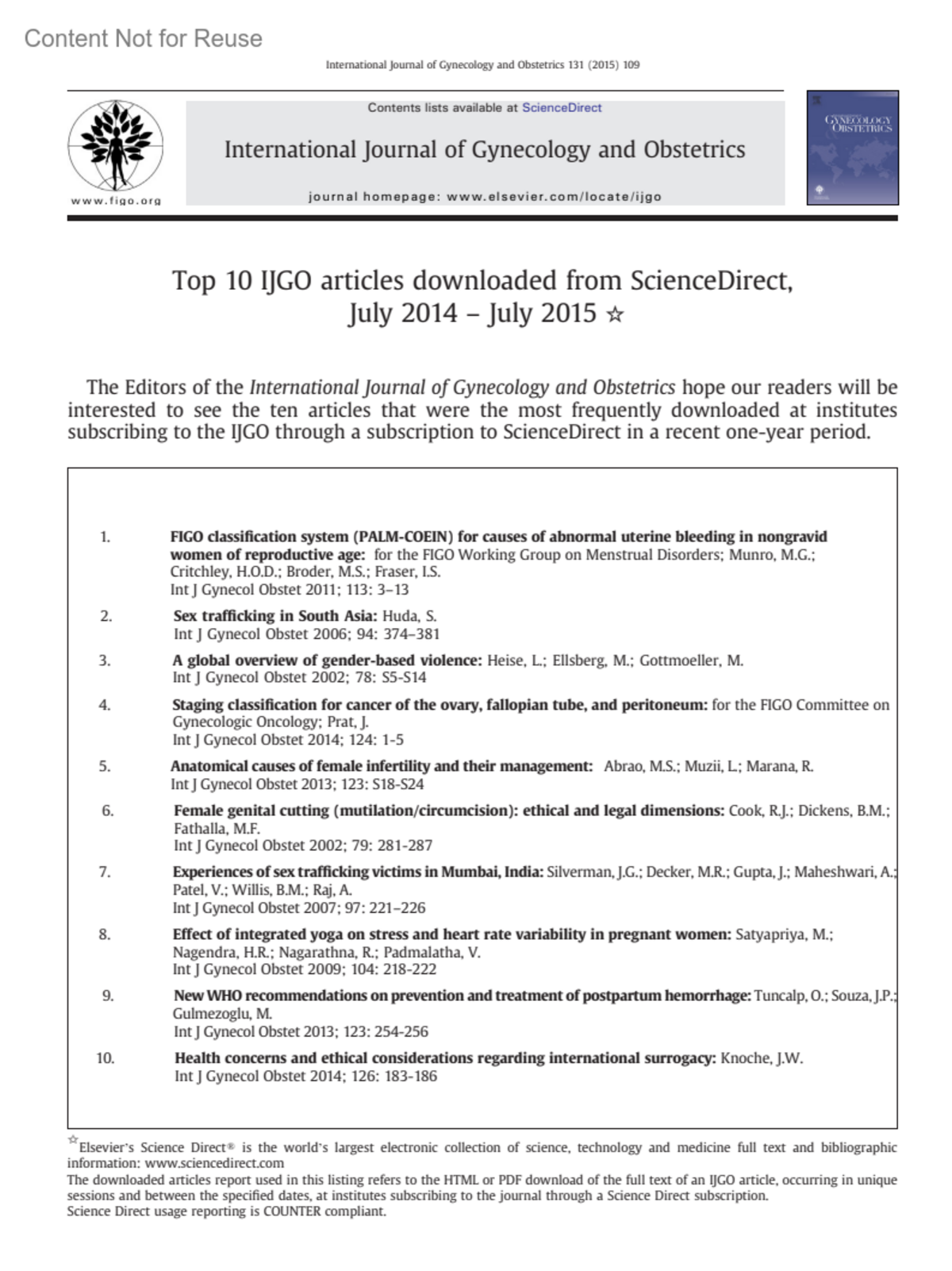 Top 10 IJGO articles downloaded from ScienceDirect, July 2014 ‐ July 2015International Journal of Gynecology & Obstetrics 131(1):p 109, October 2015. | DOI: 10.1016/S0020-7292(15)00551-2Copyright © 2015 John Wiley & Sons, Ltd