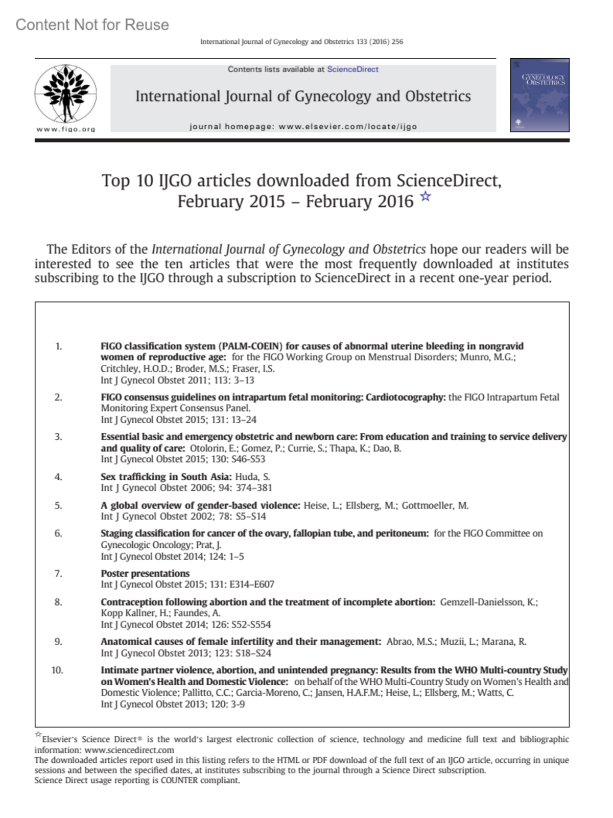 Top 10 IJGO articles downloaded from ScienceDirect, February 2015 ‐ February 2016International Journal of Gynecology & Obstetrics 133(2):p 256, May 2016. | DOI: 10.1016/S0020-7292(16)30079-0Copyright © 2016 John Wiley & Sons, Ltd