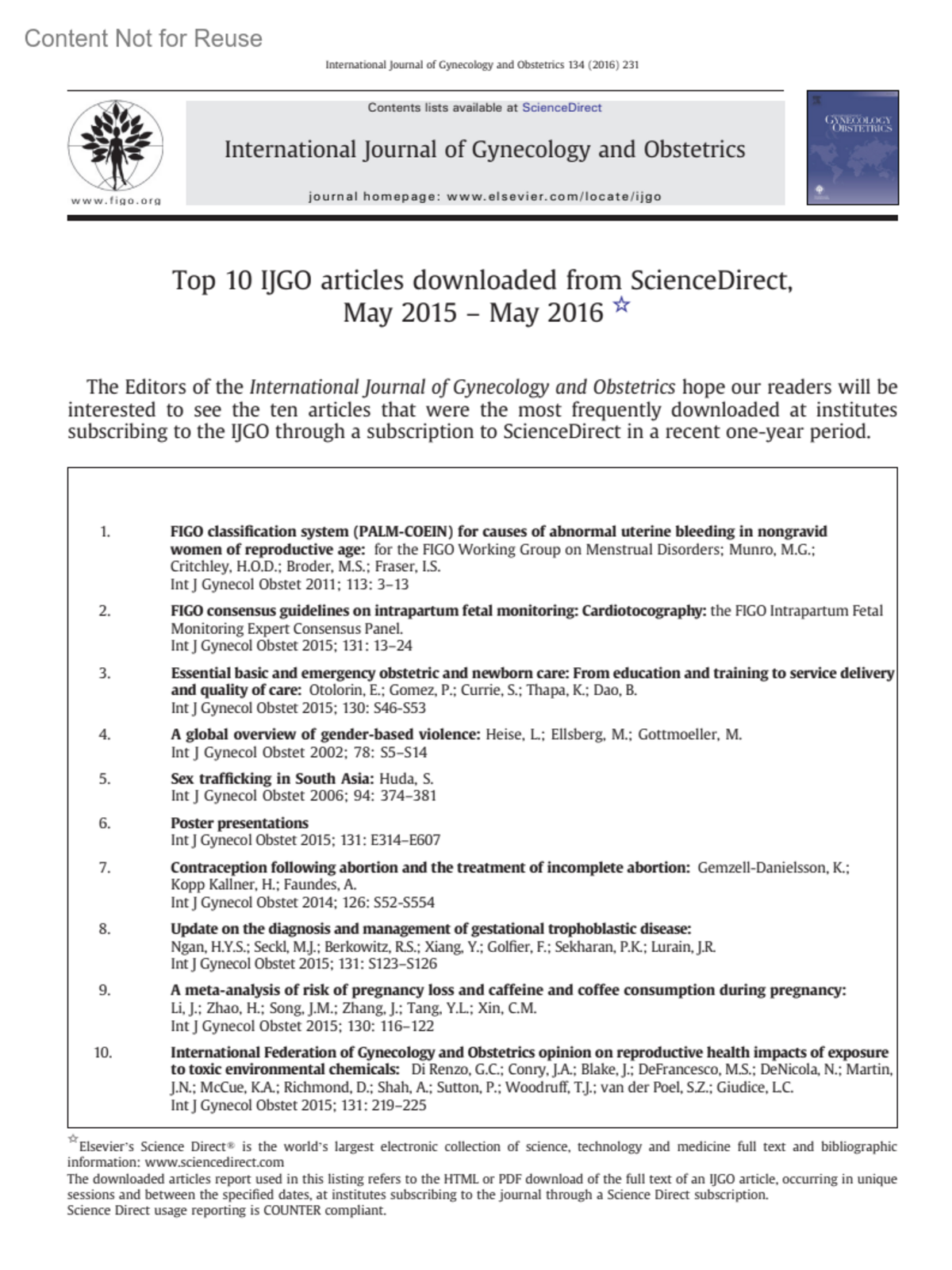 Top 10 IJGO articles downloaded from SciVerse ScienceDirect (month, year) ‐ (month, year)International Journal of Gynecology & Obstetrics 134(2):p 231, August 2016. | DOI: 10.1016/S0020-7292(16)30235-1Copyright © 2016 John Wiley & Sons, Ltd