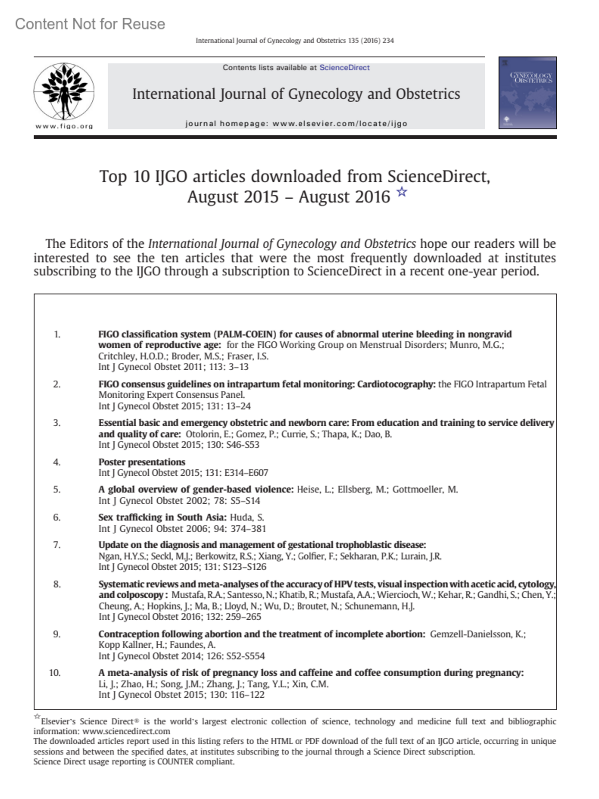 Top 10 IJGO articles downloaded from SciVerse ScienceDirect (August, 2015) ‐ (August, 2016)International Journal of Gynecology & Obstetrics 135(2):p 234, November 2016. | DOI: 10.1016/S0020-7292(16)30429-5Copyright © 2016 John Wiley & Sons, Ltd