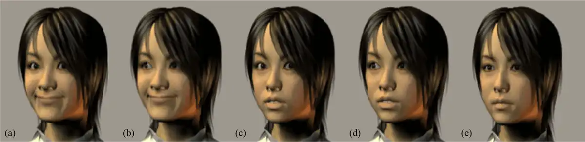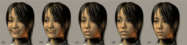 Note. (a) direct gaze, smile; (b) averted gaze, smile; (c) direct gaze, mouth opening; (d) averted gaze, mouth opening. All the faces were initially presented with (e) forward gaze and closed mouth, which was followed by a mouth movement after 1 second, and a gaze shift after another second (i.e., 2 seconds from the onset of the stimulus). After the gaze shift, the face remained still for another 4 seconds. The orientation of the face was right in half of the stimuli and the left in the other half.