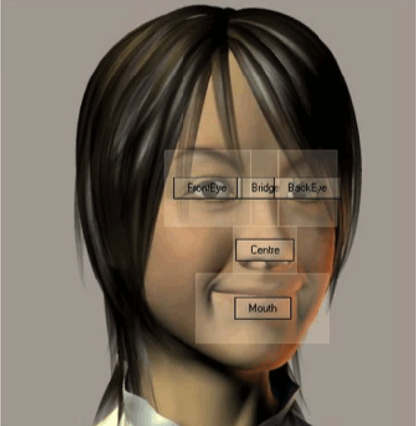 Examples of the area of interest (AOI); front eye; front eye, back eye, bridge, centre and mouth. The size and the location of the AOI were constant across different stimuli.