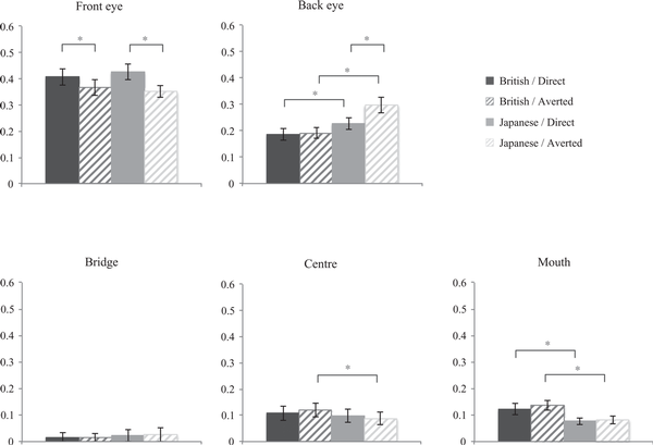 Follow-up analyses revealed that Japanese participants fixated longer on the back eye than did British participants, in both direct gaze and averted gaze conditions. British participants, by contrast, fixated longer on the mouth than Japanese participants, in both direct gaze and averted gaze conditions. British participants also showed longer fixation on the centre, which was only significant in the averted gaze condition (Figure 3).