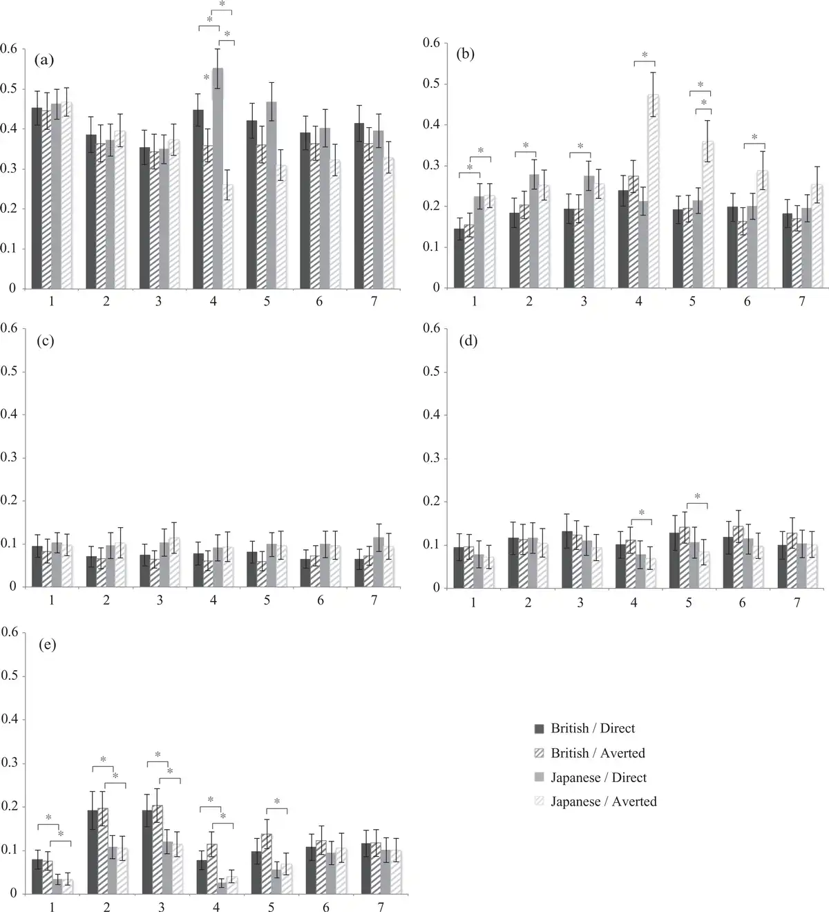 In the first, second and third bins, the only significant effects were the differences between groups, with Japanese participants fixating longer than British participants. From the fourth bin onward, however, Japanese participants fixated longer than British participants only in the averted gaze condition, but not in the direct gaze condition (Figure 4b).