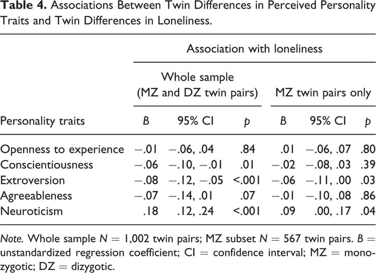 Third, to test for genetic confounding, we calculated within-twin pair difference scores for each family in the sample, by subtracting Twin 2’s score from Twin 1’s score on each of the key variables (i.e., loneliness and each of the perceived personality traits). A significant association between twin differences in loneliness and twin differences in (for example) neuroticism would indicate that the association between these two traits cannot be explained by the shared environment (i.e., environmental influences that make twins similar to each other). This is because twins who grow up in the same home environment are assumed to be matched for these influences. By further restricting the analyses to MZ twin pairs, who are also matched for their genomes, genetic influences are held constant as well. Therefore, if the twin difference scores remain significantly associated with each other among MZ twins, the association between the two traits cannot be entirely explained by genetic differences.