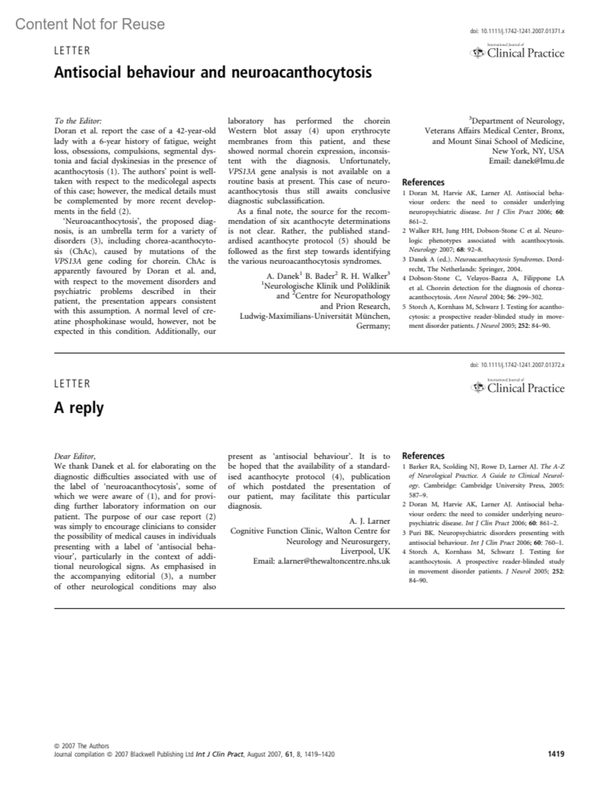 Antisocial behaviour and neuroacanthocytosisLarner, A. J.Author informationCognitive Function Clinic, Walton Centre for Neurology and Neurosurgery, Liverpool, UKEmail: [email protected]International Journal of Clinical Practice 61(8):p 1419, August 2007.Copyright © 2007 Blackwell Publishing Ltd.