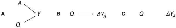An example of a standard directed acyclic graph (DAG) (panel A) and two possible interaction DAGs (IDAGs) (panels B and C). Variables A (warfarin) and Q (smoking) influence Y (ischaemic stroke). Panel B suggests that Q also influences the effect of A on Y, whereas panel C suggests that this is not the case
