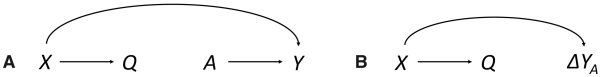Confounded interaction or ‘effect modification by proxy’. A standard directed acyclic graph (DAG) is given in panel A and an interaction DAG (IDAG) in panel B. Variables X (genotype) and A (bariatric surgery) influence Y (weight loss), with an interaction present. The effect of A is modified by Q (hair colour), but there is no interaction between A and Q