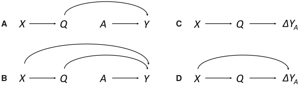 Two examples of standard directed acyclic graphs (DAGs) (left) and two interaction DAGs (IDAGs) (right). The variable Y (a disease) is directly influenced by A (treatment), Q (smoking) and potentially also X (education). The DAG in panel A is compatible with the IDAG in panel C, whereas the DAG in panel B is compatible with either of the IDAGs in panels C and D