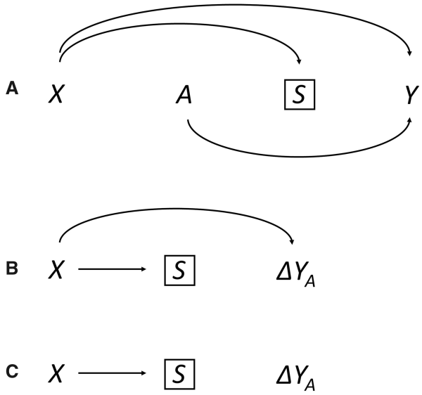 Sample selection potentially compromising generalizability. Individuals are selected based on S. X may represent socioeconomic status, A some treatment, and Y a disease. The standard directed acyclic graph (DAG) in panel A is compatible either with the interaction DAG (IDAG) in panel B or the one in panel C, where generalizability is only compromised in the scenario depicted in panel B