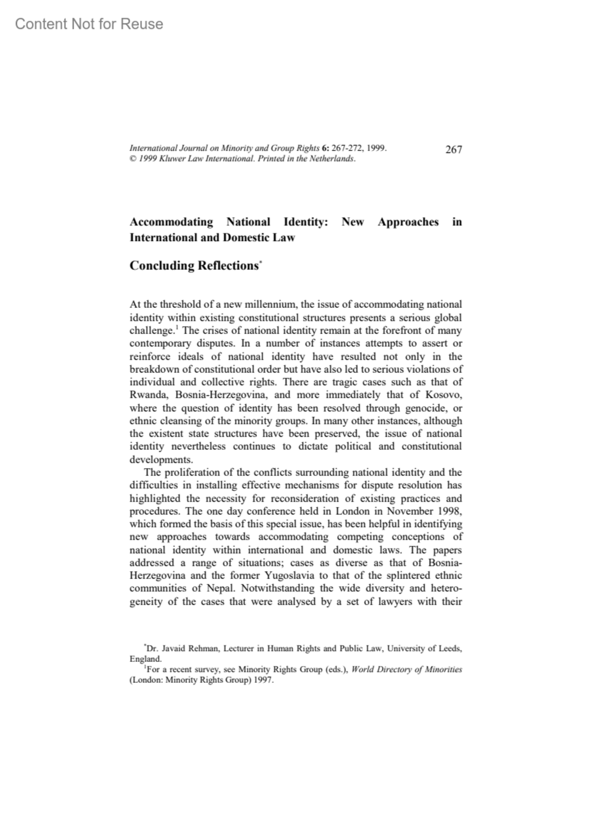 Accommodating National IdentityNew Approaches in International and Domestic LawRehman, JavaidAuthor informationLecturer in Human Rights and Public Law, University of Leeds, EnglandInternational Journal on Minority & Group Rights 6(2):p 267-272, 1999.Copyright ©1999 Kluwer Academic Publishers