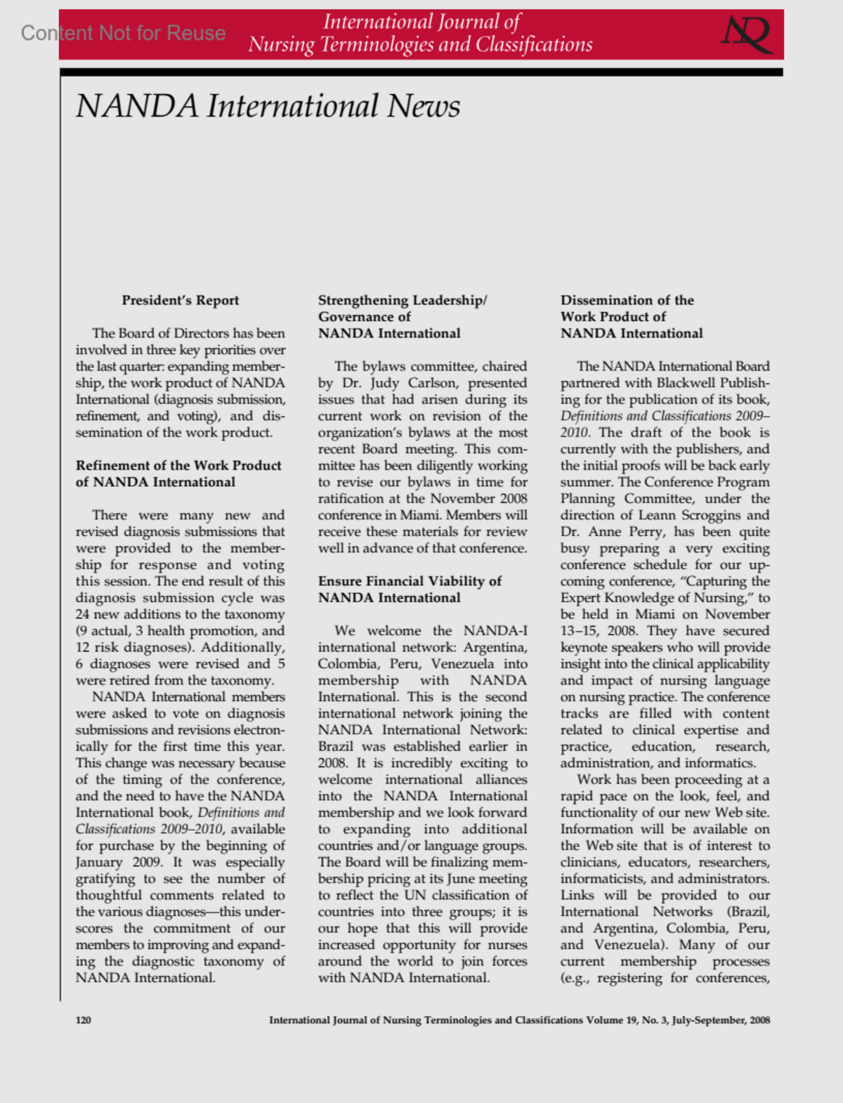 NANDA International NewsHerdman, T. Heather RN, PhDAuthor informationPresident, NANDA International [email protected]International Journal of Nursing Terminologies and Classifications 19(3):p 120-121, July-September 2008.Copyright © 2008 Blackwell Publishing Ltd.