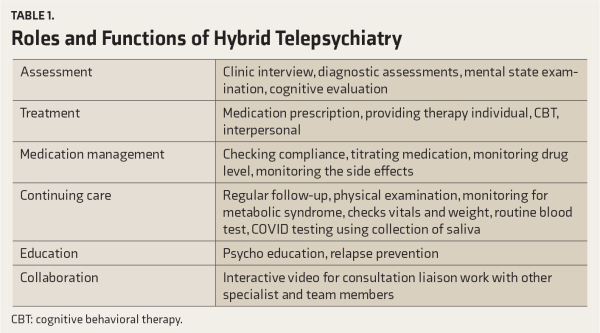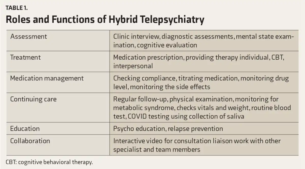 The evidence for the benefits of “hybrid” care in services in remote and rural areas is still emerging. However, evidence supports that hybrid care model undoubtedly reinforces the patient’s willingness to participate in the outpatient clinical services and engage with their clinical team. It can also help in improving medication adherence in severe mental illness. Also, hybrid psychiatric care had enhanced overall service delivery and helped improve outpatient follow-ups with the specialists compared with patients who had only the outpatient clinical services. Literature review reveals that patients living in urban area have better follow-up than patients in rural area. This disparity exists both in India and the USA. This lack of equitable distribution between rural and urban health care can be remedied by using telepsychiatry as important fragment of hybrid care service model to make sure that the mental health services are available to people living outside the urban areas.,