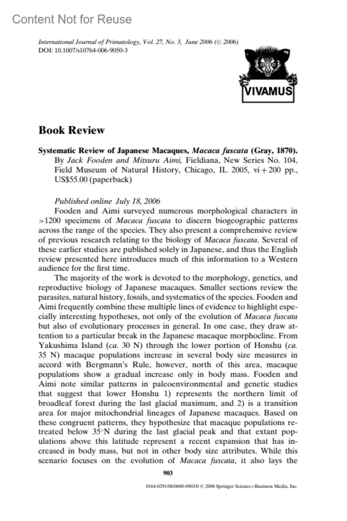 Systematic Review of Japanese Macaques, Macaca fuscata (Gray, 1870). By Jack Fooden and Mitsuru Aimi, Fieldiana, New Series No. 104, Field Museum of Natural History, Chicago, IL 2005, vi+200 pp., US$55.00 (paperback)