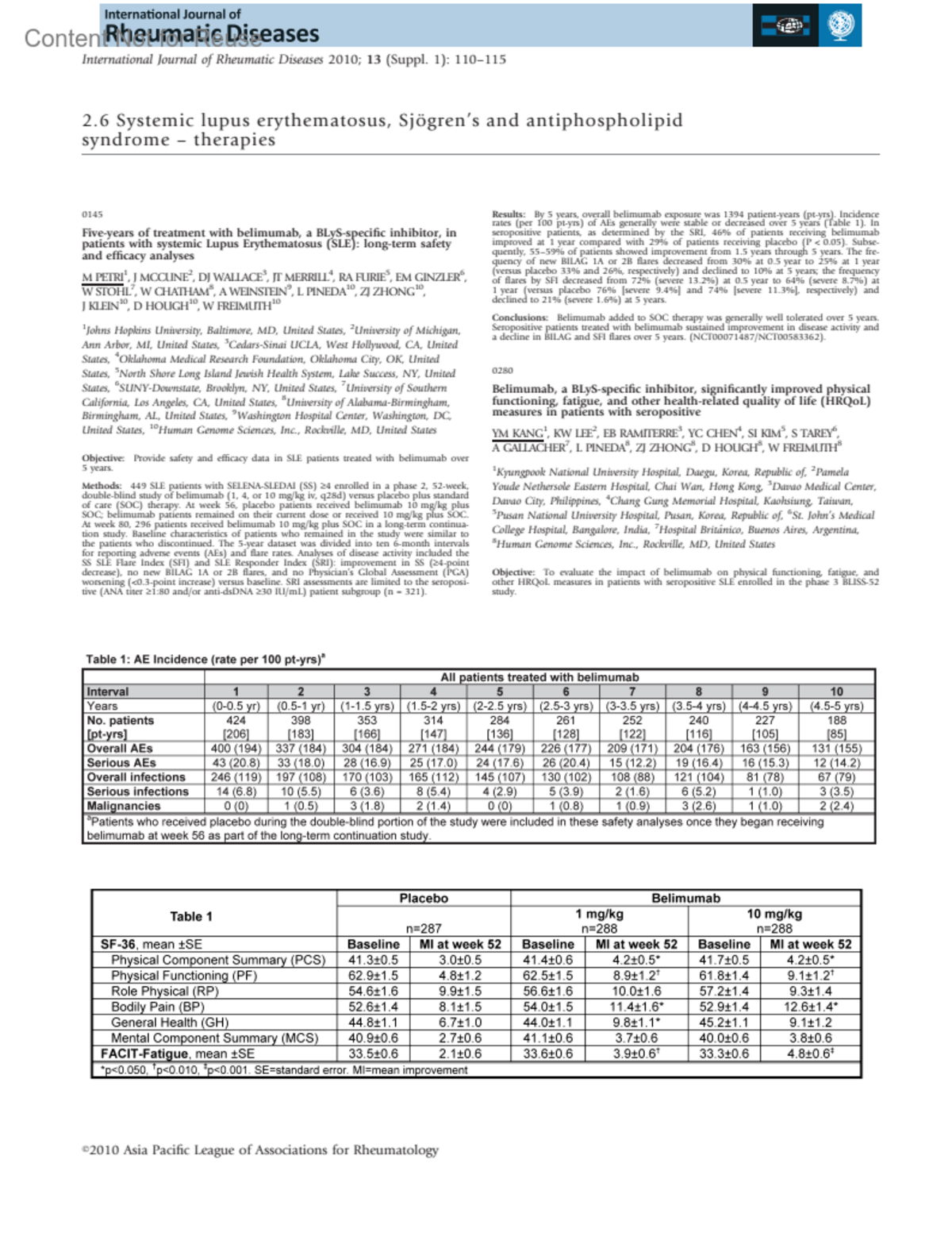 International Journal of Rheumatic Diseases 13:p 110, July 2010.