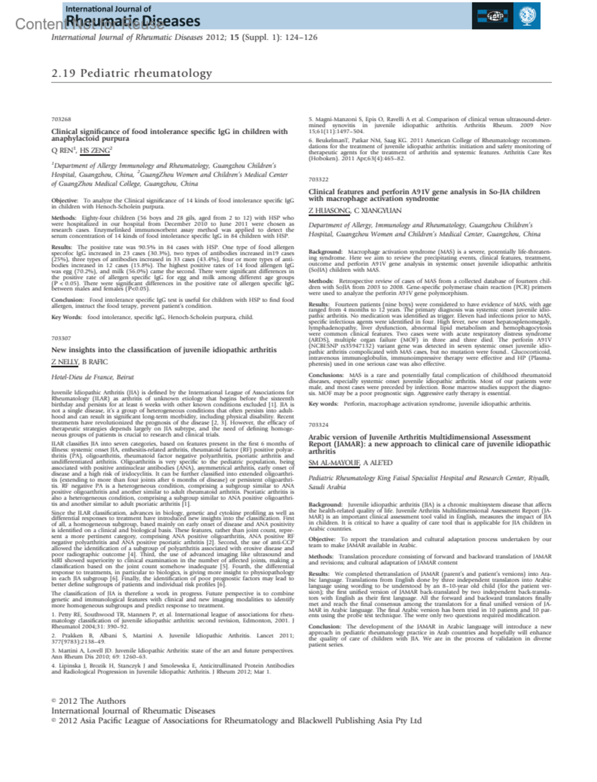 Clinical features and perforin A91V gene analysis in So-JIA children with macrophage activation syndrome703322HUASONG, ZXIANGYUAN, CAuthor informationDepartment of Allergy, Immunology and Rheumatology, Guangzhou Children's Hospital, Guangzhou Women and Children's Medical Center, Guangzhou, ChinaInternational Journal of Rheumatic Diseases 15:p 124, September 2012.Copyright © 2012 John Wiley & Sons, Inc.